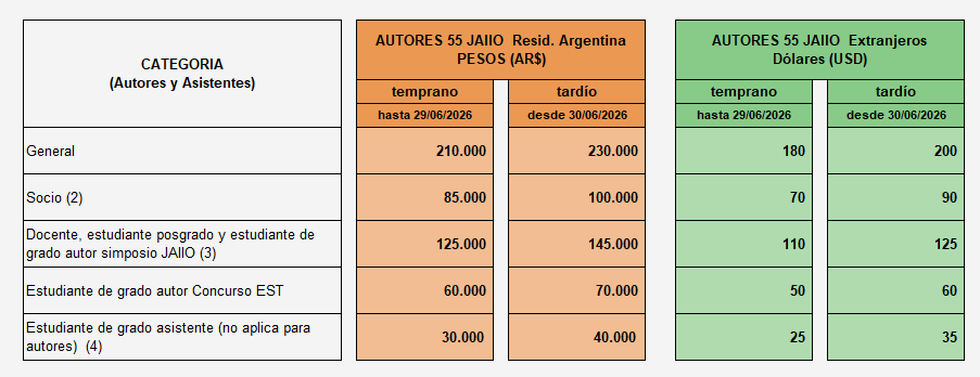 Consultar por paquetes estudiantiles y para inscripciones de grupos de 10 o más participantes escribiendo a jaiio@sadio.org.ar